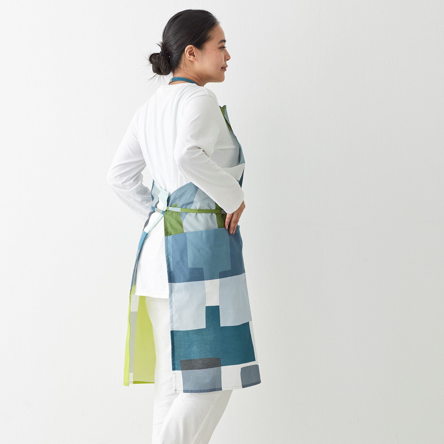 シンプルでありながら印象的なフォルムとテキスタイルデザインが融合し、着るだけで気持ちのスィッチが入り、楽しく前向きになれるそんなエプロンです。